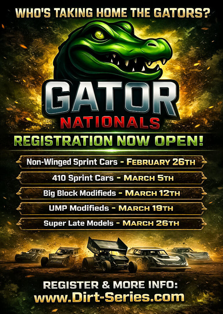 2026 Gator Nationals • Fixed Setup • 5 Events, 5 Classes, 1 Champion (NW Sprints, 410 Sprints, Big Blocks, UMP Modifieds & Super Late Models) • FREE to Register • $15 to be a Series Member